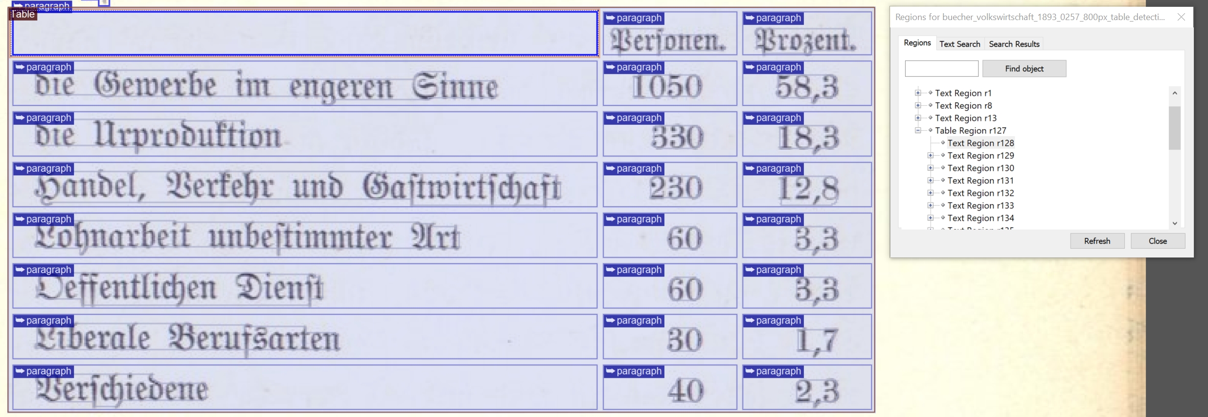 Das Tabellen Level 2 table detection dient vorrangig der Erkennung, dem Training und der Validierung von explizit annotierten Tabellen. Bei der Segmentierung wird die Tabellenregion (TableRegion) annotiert. Eine Rekursion der Annotation von TextRegion oder verschachtelte Regionen ist auszuschließen.
