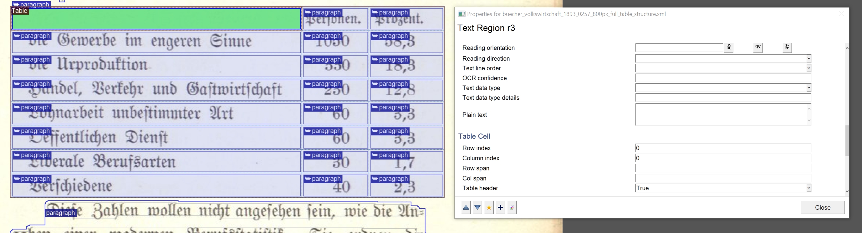 Das Tabellen Level 4 full table structure dient vorrangig der Erkennung, dem Training und der Validierung der vollständigen Struktur und dem Inhalt von Tabellen. Die Struktur einer Tabelle definiert sich als Annotation von Zeilen, Spalten sowie der Annotation von sematischen Merkmalen der Tabellenzellen wie dem Tabellenkopf. Bei der Segmentierung wird die Tabellenregion (TableRegion) annotiert. Eine Rekursion der Annotation von TextRegion oder verschachtelte Regionen ist auszuschließen.